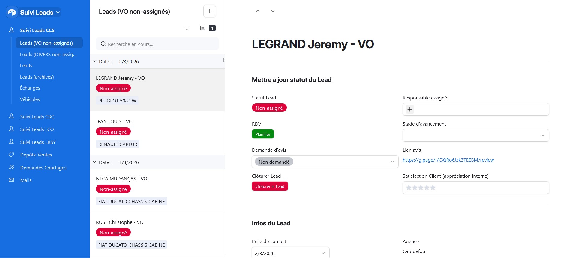 Leads (divers non assignés) Leads en attente provenant de la boite mail vente@backcar.fr. Le suivi est créé à partir de la demande du client et de ses informations récupérées dans le mail.